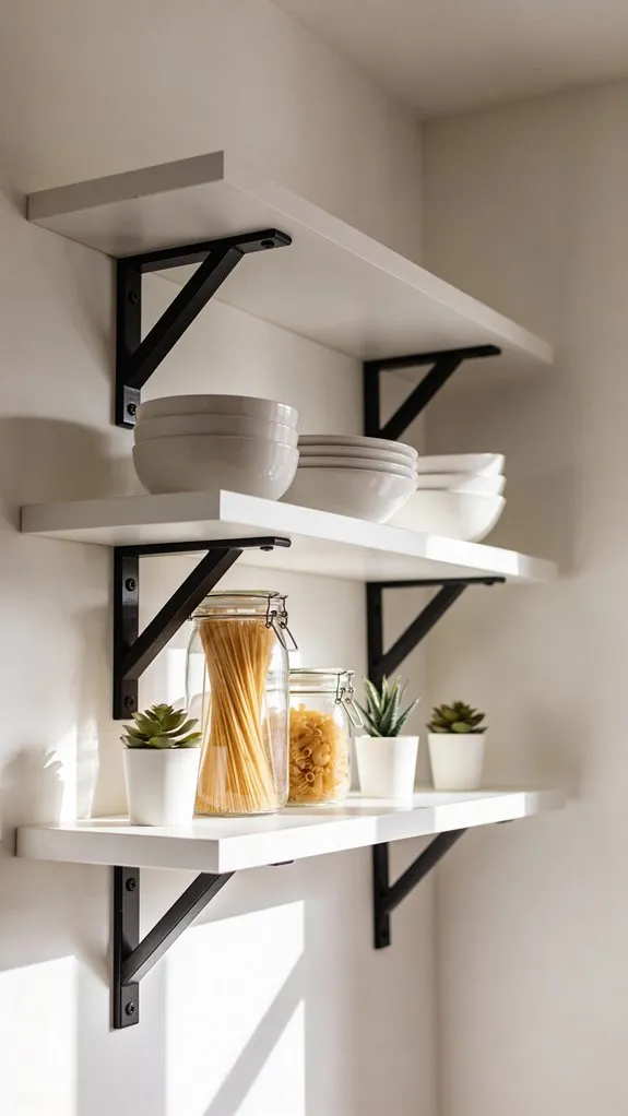 Floating shelves add both function and visual interest. They open up the space while giving you a place to display dishes, jars, or decorative items, making your kitchen feel more personalized and airy.