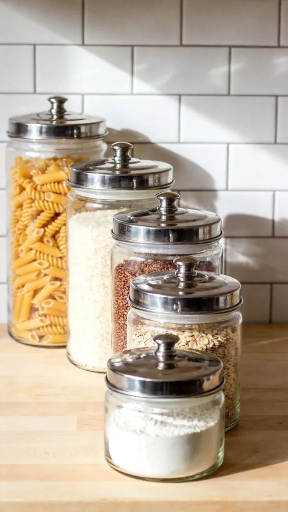 Clear glass canisters create a clean, organized look while keeping ingredients fresh. They turn everyday items like pasta, flour, and coffee into part of your kitchen décor.