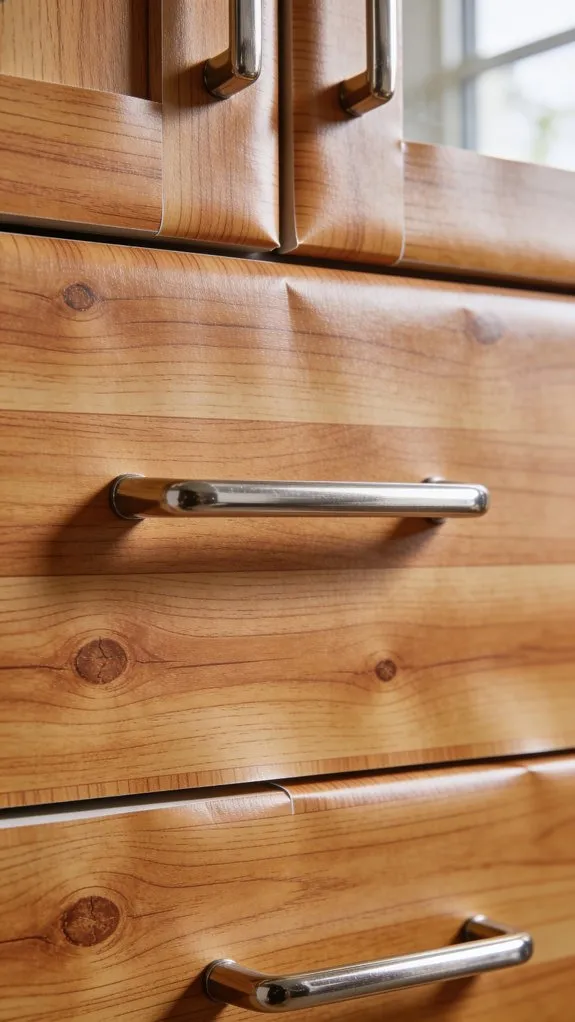 Wood-grain or textured contact paper can mimic the look of real wood cabinetry. It’s a simple and cost-effective way to refresh worn or outdated drawer fronts.