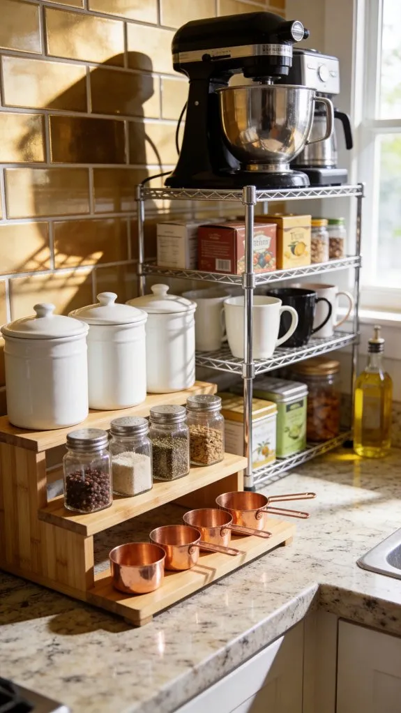 Use vertical storage solutions like tiered racks or risers to free up counter space. This not only improves organization but also makes your kitchen feel larger and more intentional.