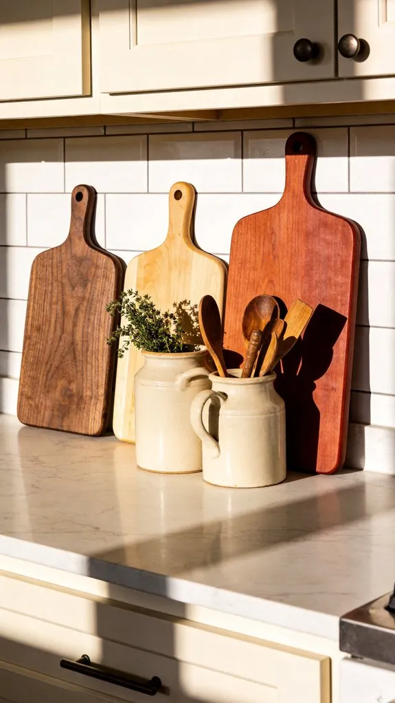 Add warmth with wooden cutting boards, ceramic crocks, and natural textures. These elements bring depth and a welcoming, lived-in feel to your kitchen.