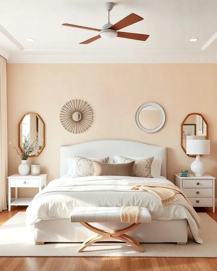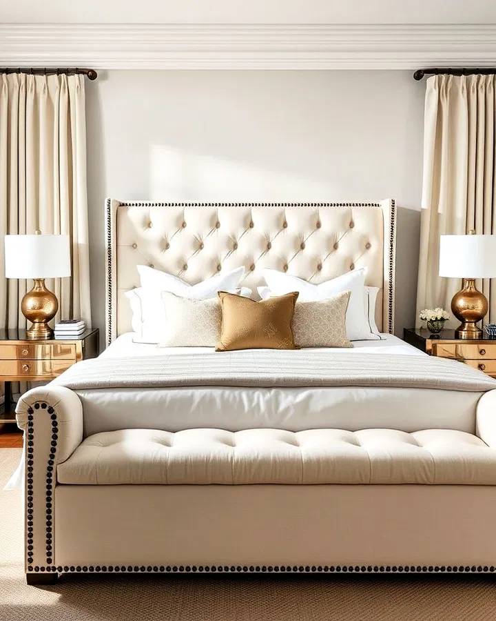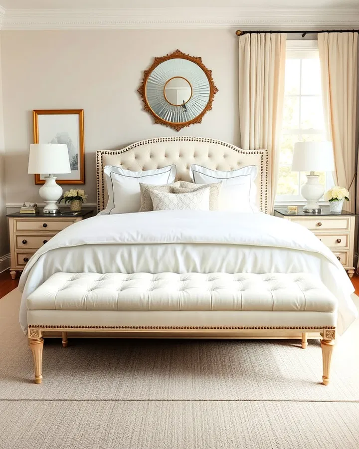 A cream upholstered bench adds both style and practicality. Placed at the foot of the bed, it provides extra seating, a place to lay out clothes, or even hidden storage if designed with compartments.
