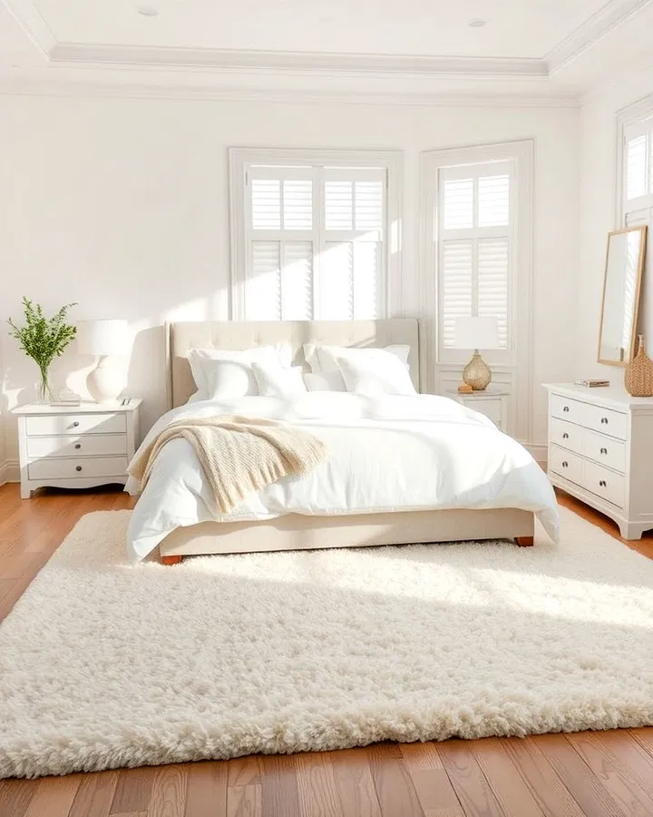 Choose a rug with a soft texture or subtle pattern to enhance visual interest without overwhelming the room. The neutral tone complements white furniture beautifully, creating a balanced and harmonious look. It’s a simple addition that makes a big difference in overall comfort.