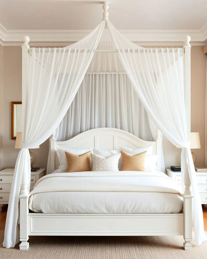 A white canopy bed creates a stunning focal point that instantly elevates the room. The flowing fabric adds a sense of romance and softness, making the space feel dreamy and luxurious.
