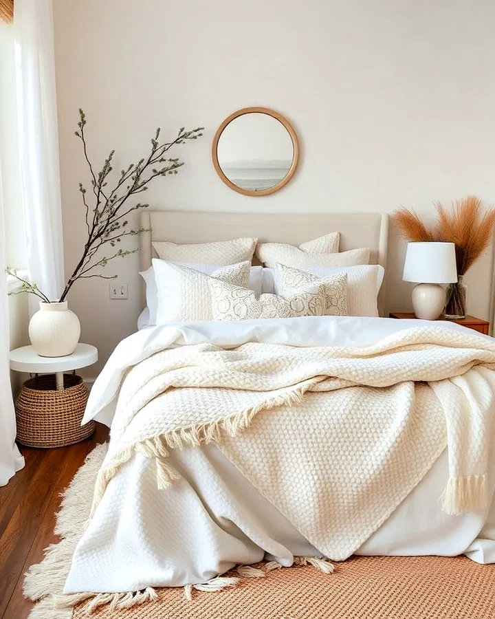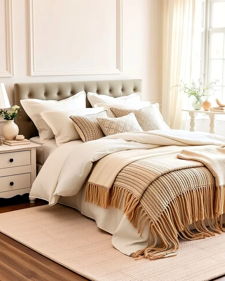 Layering is key when working with a neutral palette. Without it, a white and cream bedroom can feel flat or uninspired. By combining different textiles—such as chunky knit throws, soft linen sheets, and plush pillows—you create visual interest and tactile comfort.