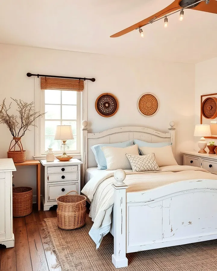 Incorporating rustic elements can add character and warmth to your bedroom. Think whitewashed wood, woven baskets, or vintage-inspired rugs in soft neutral tones.