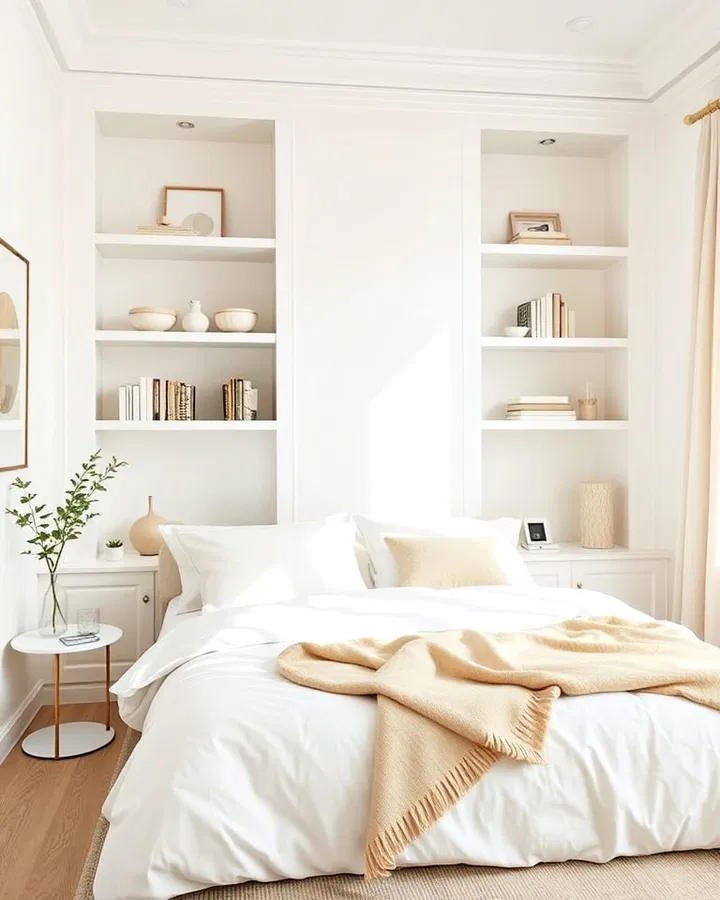 White built-in shelving is a practical and stylish way to maximize space. It keeps your bedroom organized while seamlessly blending into the overall design. The clean lines of white shelves contribute to a minimalist aesthetic.