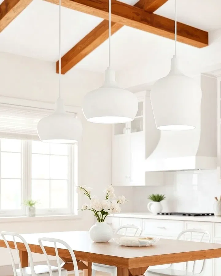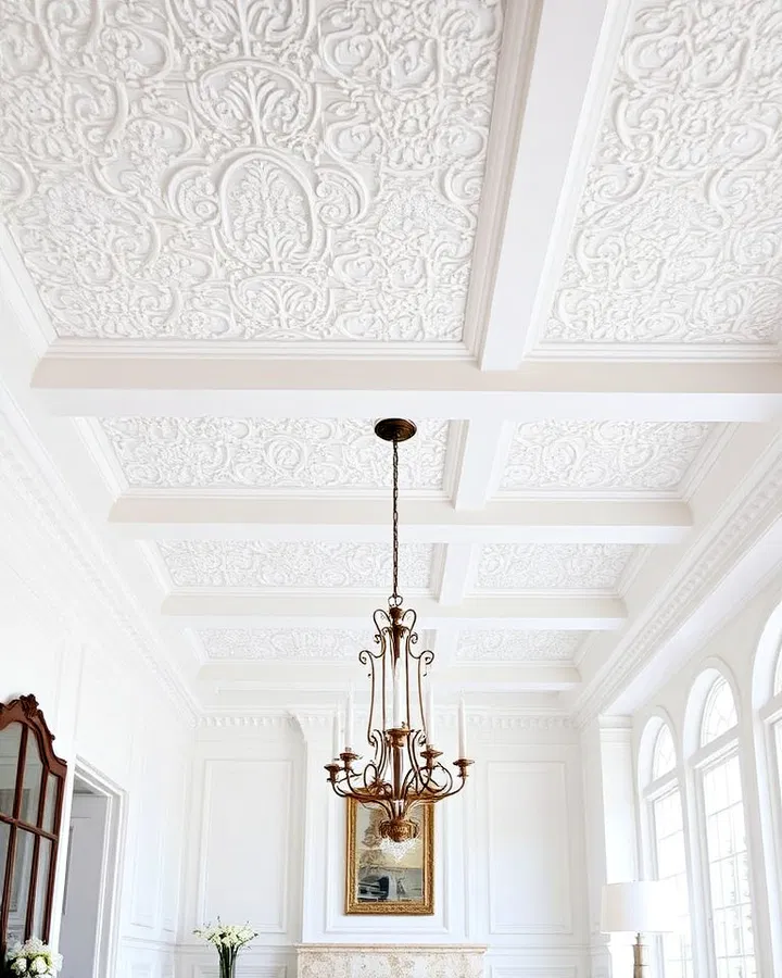 Coffered panels, beams, or molding add dimension without taking away from the clean white look. It’s subtle, but it makes the whole room feel more finished.