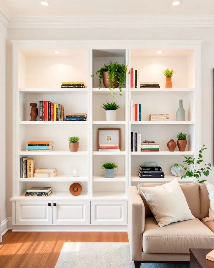 They give you storage without making the room feel heavy. Style them with books, wood tones, or greenery so they don’t feel too sterile.