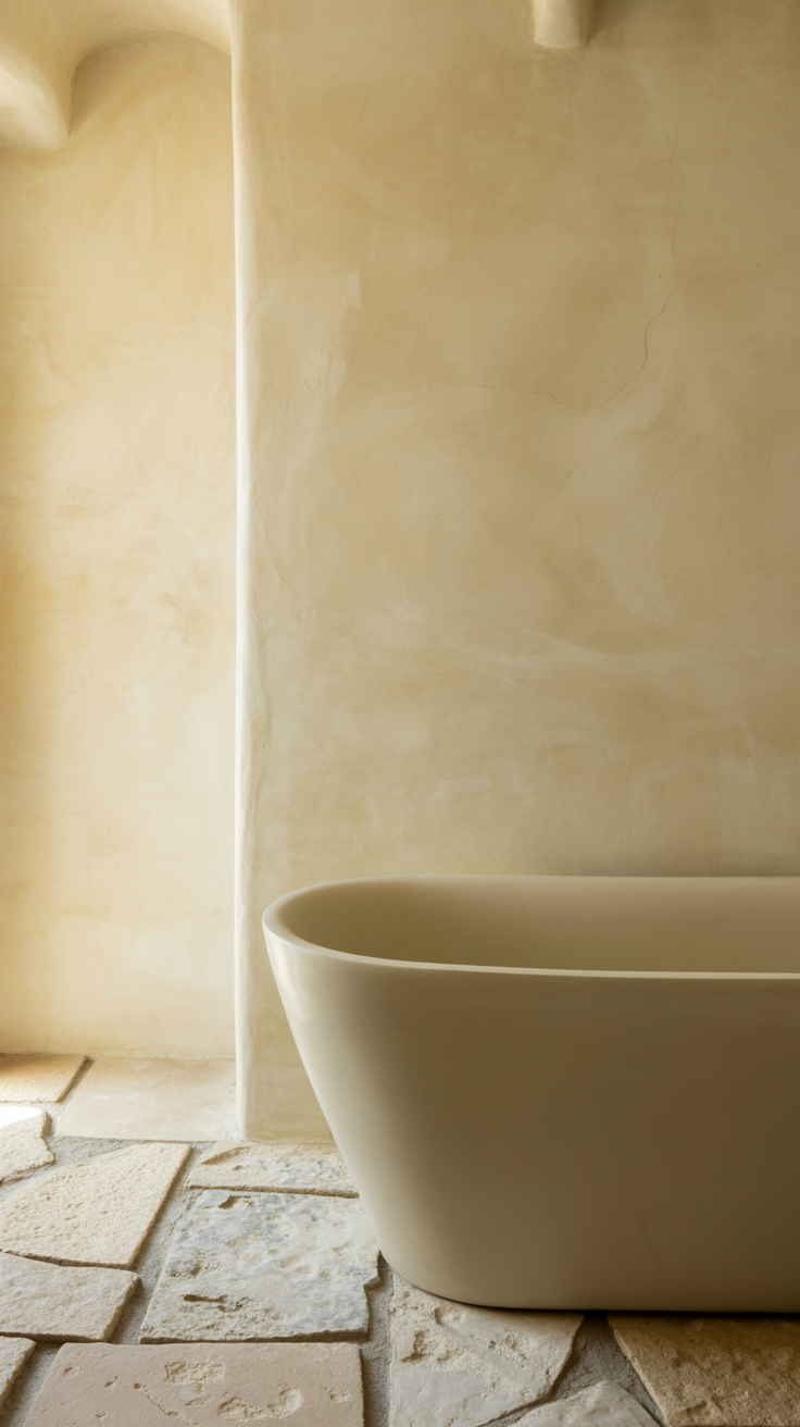 • Spa-inspired finishes: limewashed plaster walls or textured surfaces
