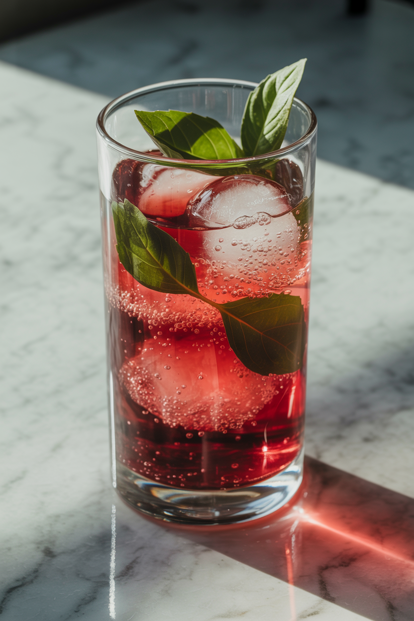 Method: Make a shrub by simmering raspberries with sugar until they break down: cool and strain solids into a bowl. Stir in apple cider vinegar and chopped basil: let sit in the fridge for at least 2 hours (overnight is better). To serve, mix 2–3 tbsp shrub with 6–8 oz sparkling water over ice and garnish with basil.