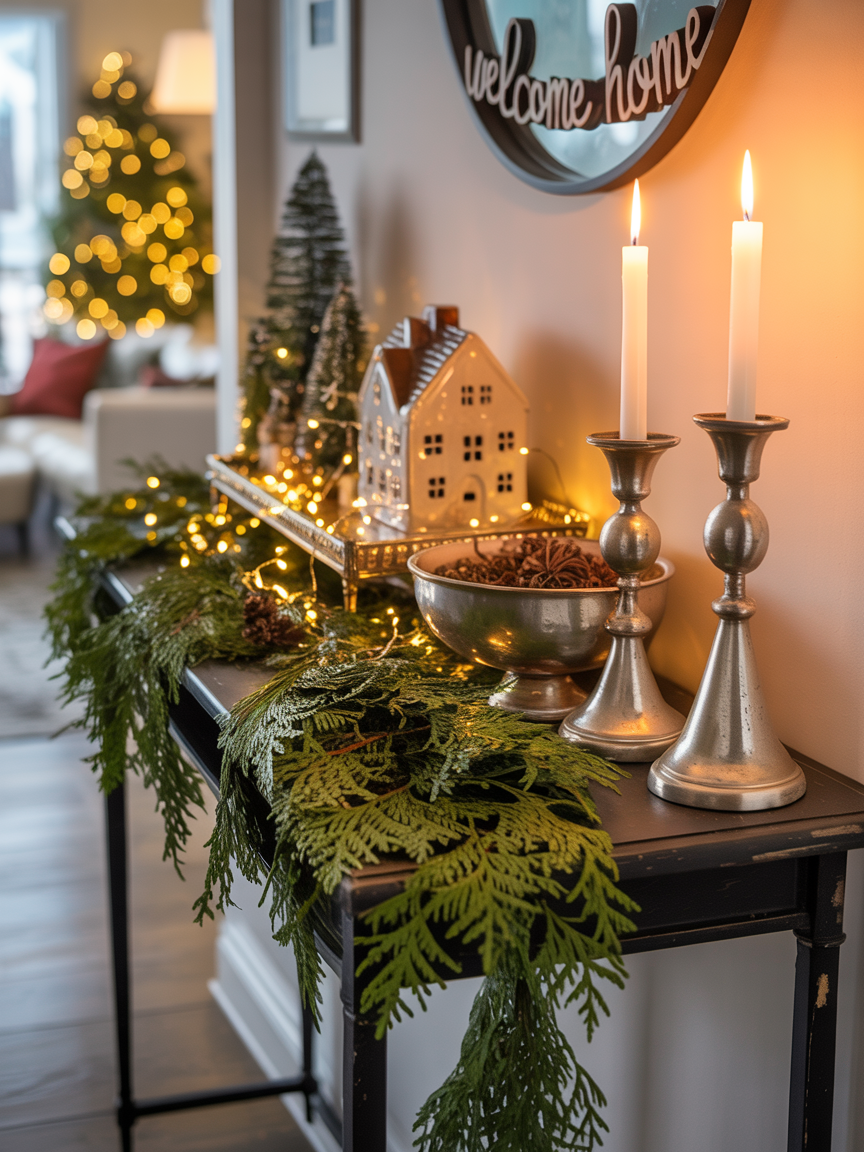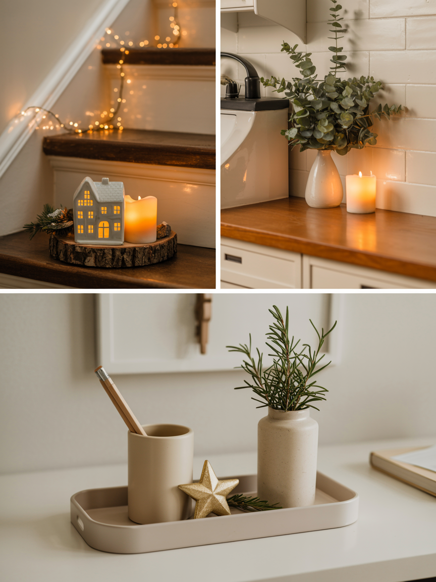 - Staircase Landing: A narrow tray with a single ceramic house, a tiny wreath, and flameless tea lights can create a soft, welcoming glow for those ascending or descending.
