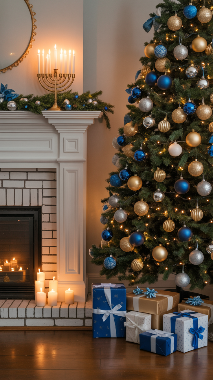 Think of it as creating your own “Festival of Lights and Cheer” — where blue and gold meet red and green, dreidels share shelf space with ornaments, and latkes and gingerbread cookies sit side by side on the dessert table.