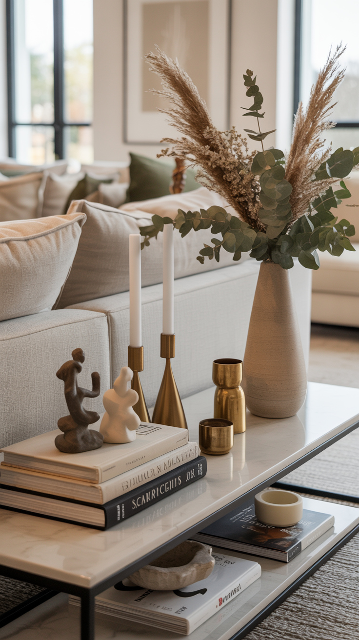 Asymmetrical Styling: Feels relaxed and modern. Example: tall vase on one side, stack of books with a small sculpture on the other.