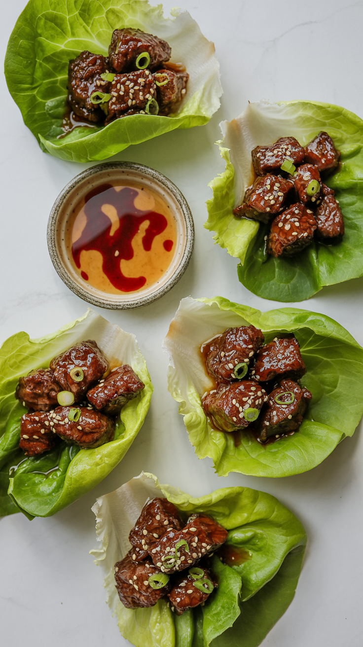 Bite-sized steak pieces seared hot and served with a cool, creamy dipping sauce.