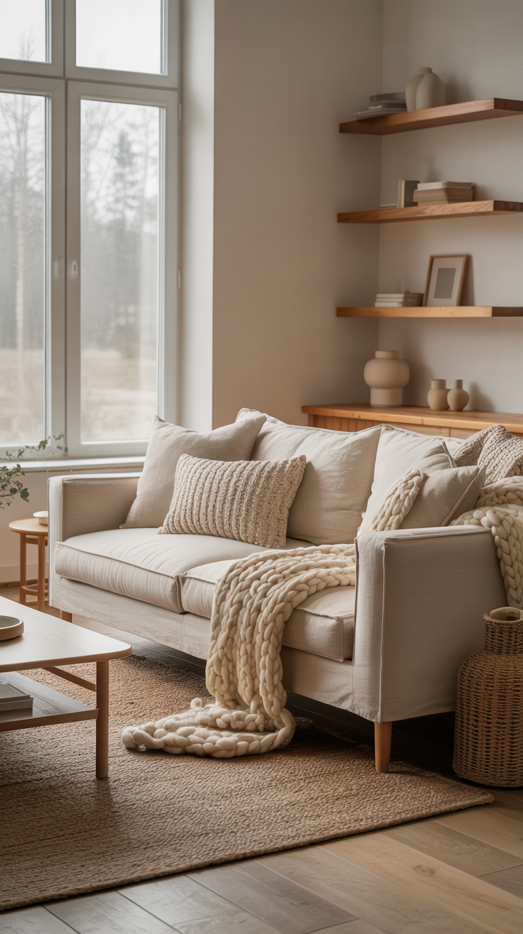To achieve this, aim for three to four smaller light sources per room. Turn off the overhead light and rely instead on a combination of floor lamps, table lamps, and wall sconces. Opt for bulbs in the 2700K range—this “warm white” is the secret to making a room feel intimate and inviting rather than clinical. Do not underestimate the power of candlelight, either. In Denmark, the concept of hygge relies heavily on the warm, flickering glow of candles to create a cozy, comforting environment. A cluster of pillar candles on a wooden tray costs very little but transforms a room entirely.