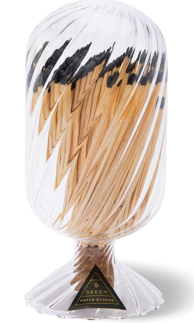 This elegant glass match cloche is a stylish accessory for any candle lover (pssst awesome gift idea!) It combines functionality with aesthetic appeal, offering a beautiful way to store matches while adding height and texture to your decor. I also love the ‘smoke’ color and the white-tipped matches, highlighting how even small details can contribute to a cohesive and sophisticated look.