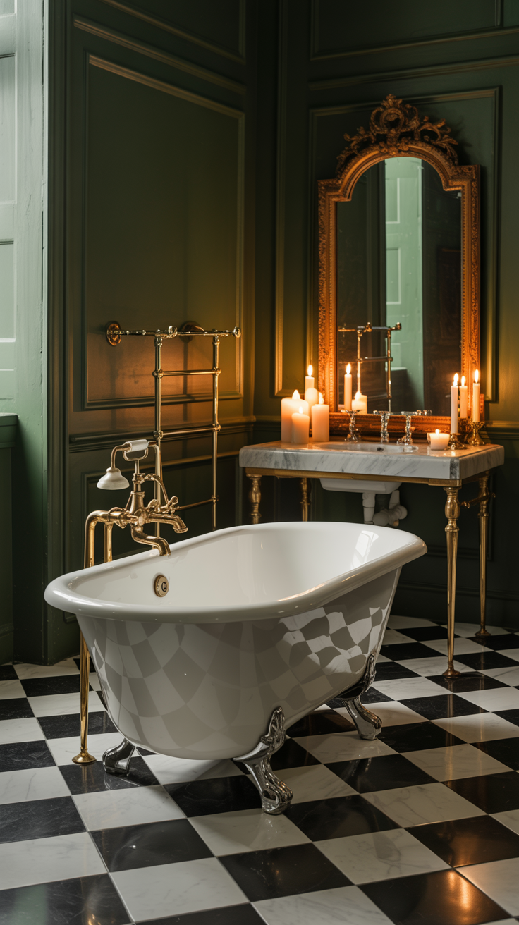 • Tiles & surfaces: Checkerboard floor or metro tiles in bottle green; soapstone or honed marble.