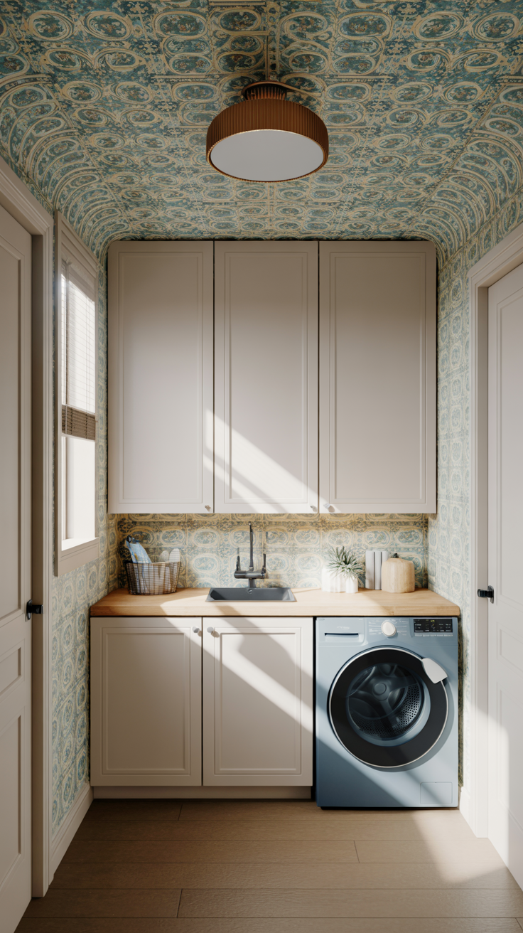 Laundry rooms are often small, which means the ceiling is relatively close and commands more visual attention than it would in a larger space. Applying a dramatic, patterned wallpaper to the ceiling transforms what was once dead space into a design statement. The effect can be whimsical (like hand-drawn botanicals or playful geometric shapes), romantic (soft florals in dusty rose and sage), or all the drama (bold damask or oversized tropical prints that envelop the room in pattern).