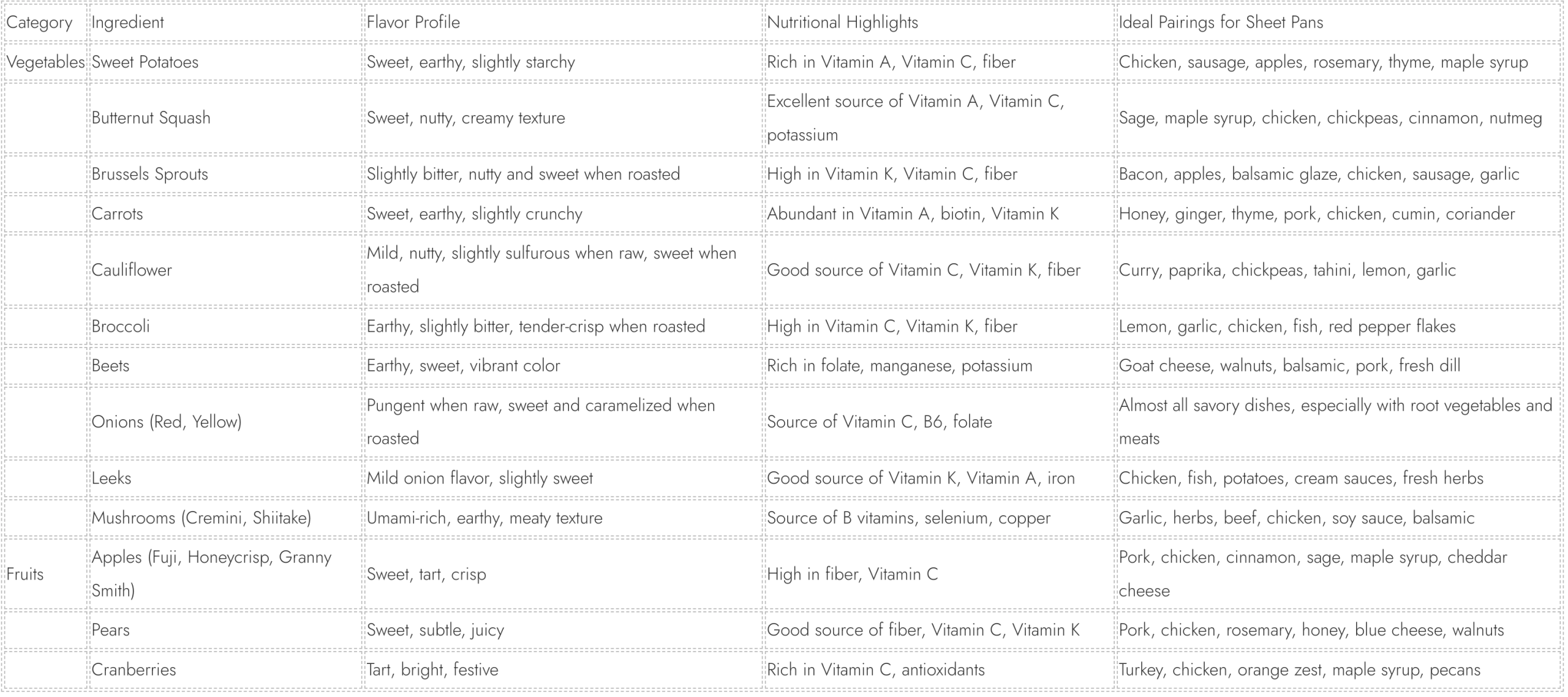 Fall is a season of unparalleled richness and generosity when it comes to fresh produce. The cooler temperatures and shorter days encourage the growth and maturation of vegetables and fruits that are not only deeply delicious but also packed with essential nutrients, vibrant colors, and robust flavors. Incorporating these seasonal ingredients into your sheet pan dinners not only enhances the overall taste and nutritional value of your meals but also supports local agriculture and often proves to be a more economical choice. The following table meticulously highlights some of the quintessential fall ingredients that are perfectly suited for the high-heat, caramelizing environment of sheet pan cooking: