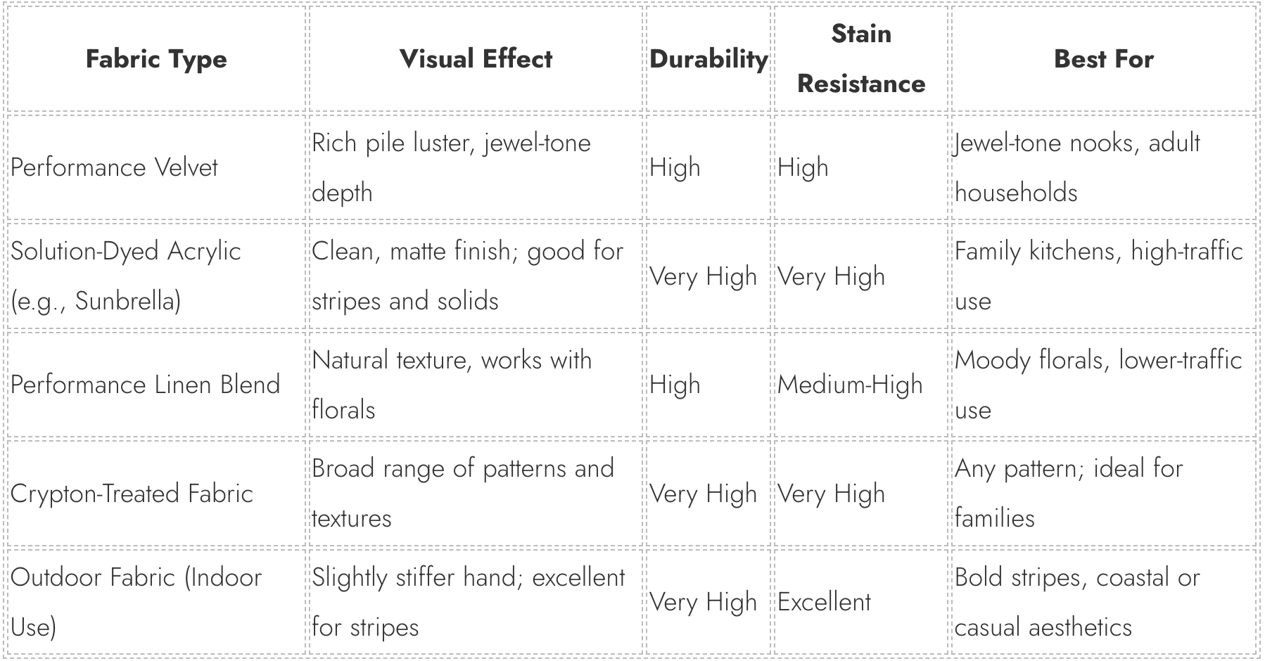 The key distinction is between decorative and performance fabrics. Traditional decorative fabrics, standard velvet, untreated linen, delicate floral chintz, are beautiful but vulnerable. They stain easily, fade in direct sunlight, and are difficult to clean without professional assistance. These are not appropriate choices for a high-use nook in a family kitchen.