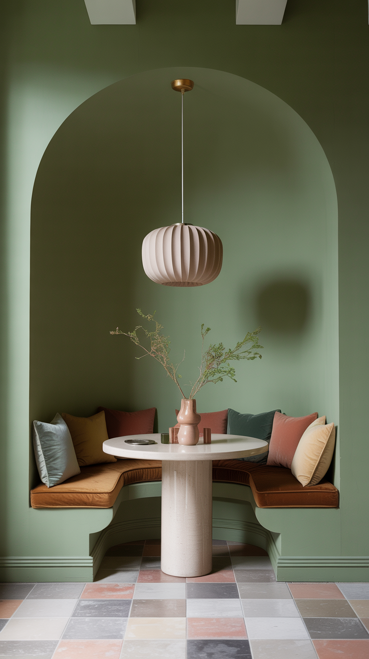 The wall treatment above and around the nook offers another opportunity for layering. A nook with bold stripe upholstery might be framed by a simple painted wall in a deep, complementary color, the stripe doing the pattern work, the wall providing a rich, solid backdrop. A floral nook might be set against a wallpaper in a coordinating botanical print, creating a fully immersive environment. A velvet nook can handle a more graphic wall treatment, a geometric tile, a lacquered paint finish, even a piece of large-format art because the velvet itself is relatively quiet in terms of pattern.