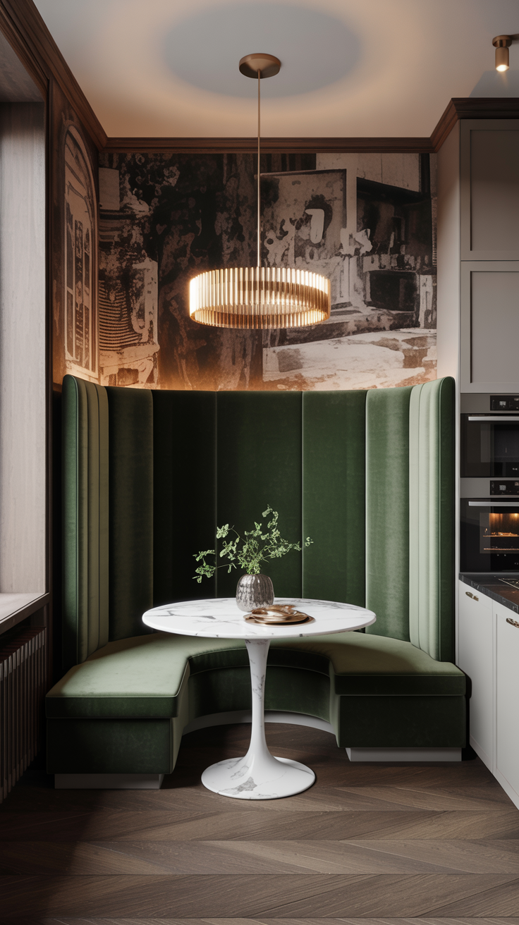 The color choice within the jewel-tone palette should be made in relation to the rest of the kitchen’s color story. Emerald green velvet is a natural partner for kitchens with brass hardware, dark-painted cabinetry, or warm wood tones. Sapphire blue reads beautifully against white or cream cabinetry, particularly when paired with silver or chrome hardware. Amethyst and deep plum are perhaps the most unexpected choices, and therefore the most rewarding, creating a nook that feels genuinely singular, unlike anything seen in a showroom or a design magazine.