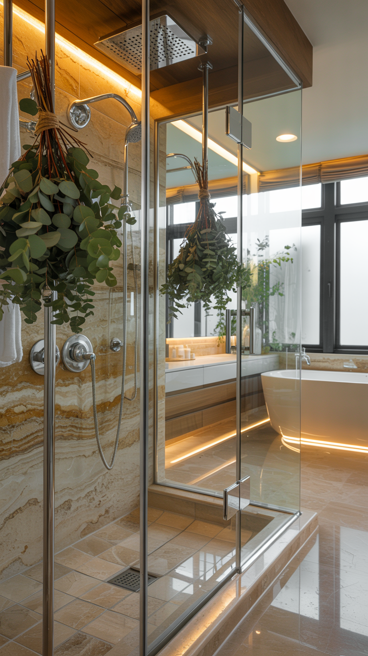 3. Add Some Greenery: A few well-placed plants can instantly make a bathroom feel more serene and spa-like. Ferns, orchids, and snake plants all thrive in the humid environment of a bathroom.  I also love just hanging some fresh eucalyptus in the shower for aromatherapy.