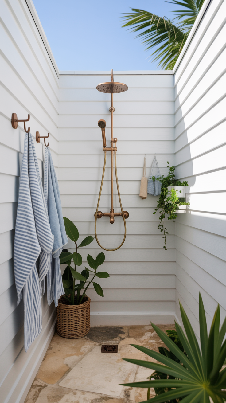 For a more contemporary, industrial, or rustic-chic look, corrugated metal is an excellent material for an outdoor shower enclosure. It is incredibly durable, relatively inexpensive, and provides complete visual privacy. When paired with warm wood accents, corrugated metal creates a striking visual contrast that elevates the design of your outdoor space.
